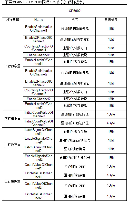 先置XD5002程数据中的下行数字量EnableChannel位,实现XD5002计数功能,然后设置下行数字量CountDirectionOfChannel位,其中0表示计数方向与实际旋转方向相同,1表示计数方向与实际旋转方向相反;