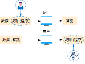 在传统的编程过程中,计算机的工作主要是根据人们给它的数据和规则去进行计算,最终得到答案。