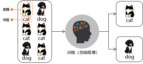 我们给计算机看几千张猫的照片,不用去给它解释猫的耳朵有点像三角形,有胡须,还会喵喵叫等等,只需要计算机通过这些照片(数据)去总结规律,自然就能认识猫了。