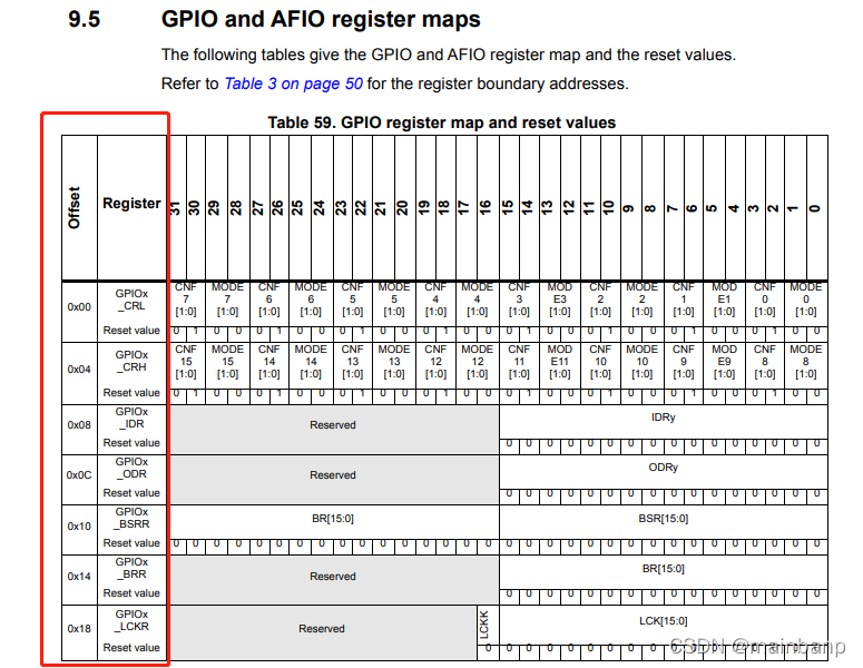 首先看到的是GPIO对应的地址映射,那么我们找对应的数据手册查找GPIO寄存器地址映射为: