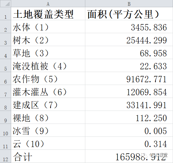 19.将像元取值替换为其代表的土地类型,将面积单位从平方米换算为平方公里,得到河南省土地覆盖类型面积统计数据。
