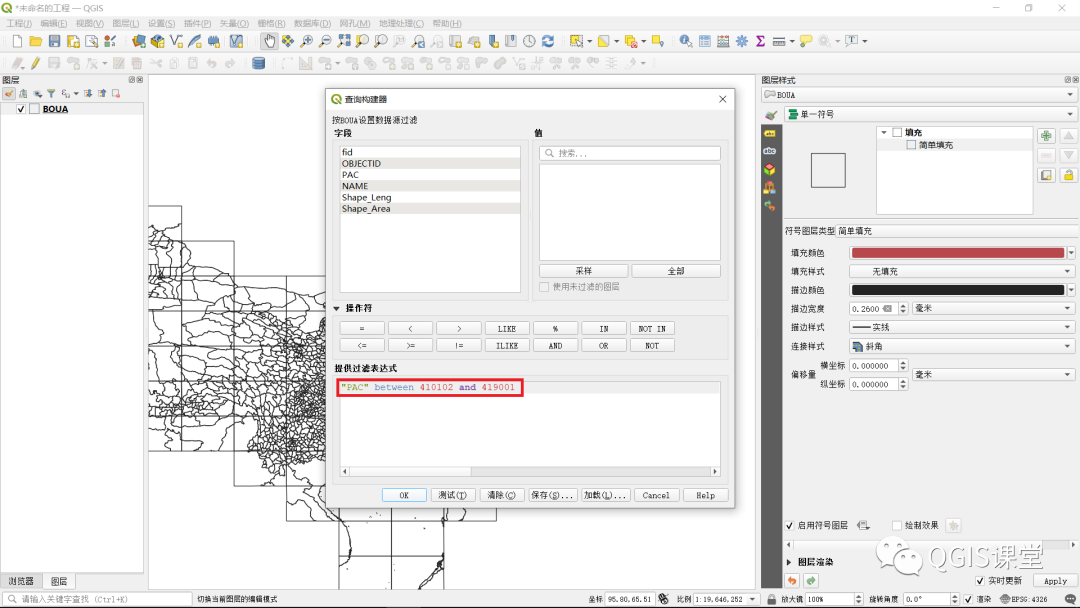 2.在“图层”面板中的BOUA图层名上点击鼠标右键,在弹出菜单中选择“过滤”,在弹出对话框下方的“提供过滤表达式”中输入:"PAC" between 410102 and 419001,然后点击“OK”按钮,BOUA图层将仅显示河南省范围。