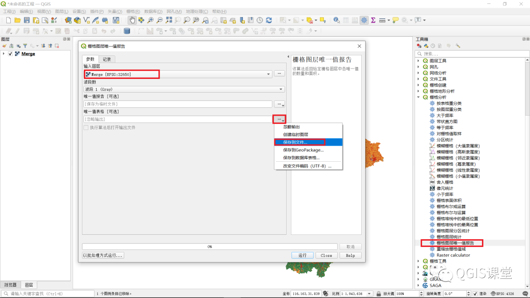 16.点击菜单“地理处理-->工具箱”,在右侧的“工具箱”面板中找到并点击“栅格分析”菜单下的“栅格图层唯一值报告”菜单项。在弹出的“栅格图层唯一值报告”对话框中,“输入图层”选择合并生成的栅格文件“Merge”,点击“唯一值表格”文本框右侧的省略号按钮,在弹出菜单中选择“保存到文件”。