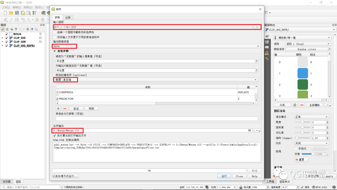13.在弹出的“合并”对话框中,点击“输入图层”右侧的省略号按钮进而选中全部三个图层,在“输出类型”下拉列表中选择“Byte”(与原始栅格文件保持一致),在“高级参数”面板中的“配置”下拉列表中选择“高压缩”,点击“合并输出”文本框右侧的省略号按钮,指定合并生成的栅格文件名称(本文将其命名为Merge.tif)和存放路径,最后点击“运行”按钮。