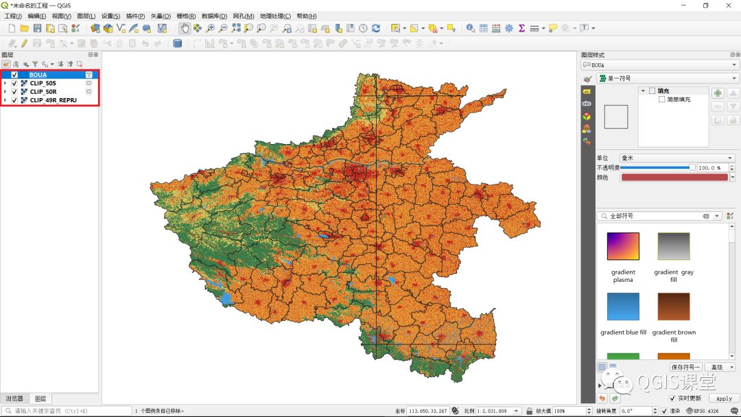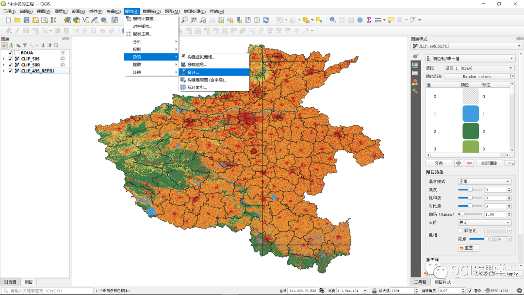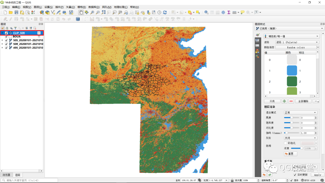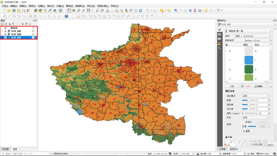 11.CLIP_49S_REPRJ图层将和CLIP_50S、CLIP_50R图层一样显示为彩色,且三个图层具有完全相同的CRS:EPSG:32650 - WGS 84 / UTM zone 50N。移除CLIP_49S图层,保留BOUA、CLIP_50S、CLIP_50R、CLIP_49S_REPRJ四个图层。
