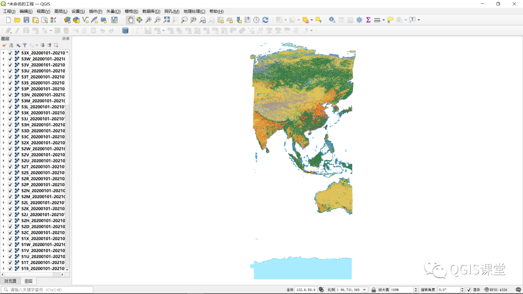 我国位于UTM投影43-53经度分带内,将以43-53之间的数字为开头的GeoTIFF文件加载到QGIS中,将地图窗口CRS设为WGS84,全幅显示和按照栅格图层原始分辨率(100%)显示的效果分别如下: