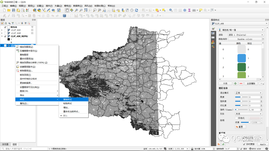 9.导出的CLIP_49S_REPRJ图层将会自动添加到地图窗口中,默认显示为灰色。在CLIP_49S图层上点击鼠标右键“样式-->复制样式”。