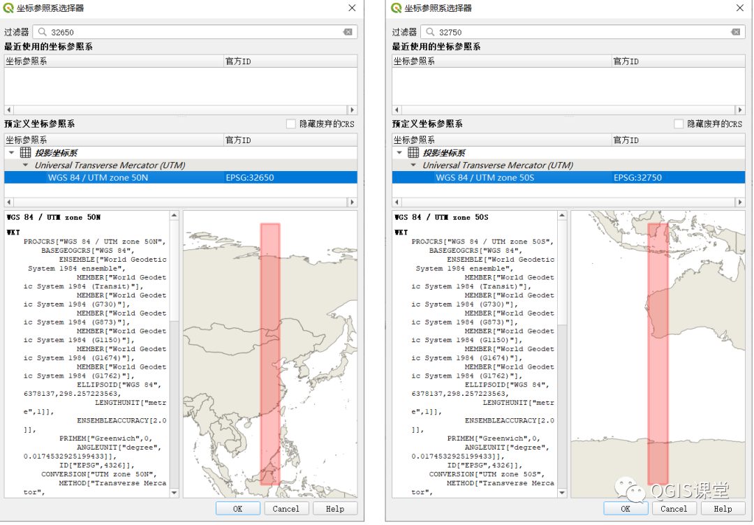 UTM投影基于WGS84坐标系,将地球分为60个南北走向的分带,每个分带所跨经度范围为6度。分带起点位于西经180度,终点位于东经180度,自西向东编号,从1编至60。在QGIS中,UTM投影每个经度分带都有两个独立的CRS,并以N和S为后缀区分北半球地区和南半球地区,如EPSG:32650 - WGS 84 / UTM zone 50N和EPSG:32750 - WGS 84 / UTM zone 50S,分别代表50号分带在北半球和南半球区域的CRS。