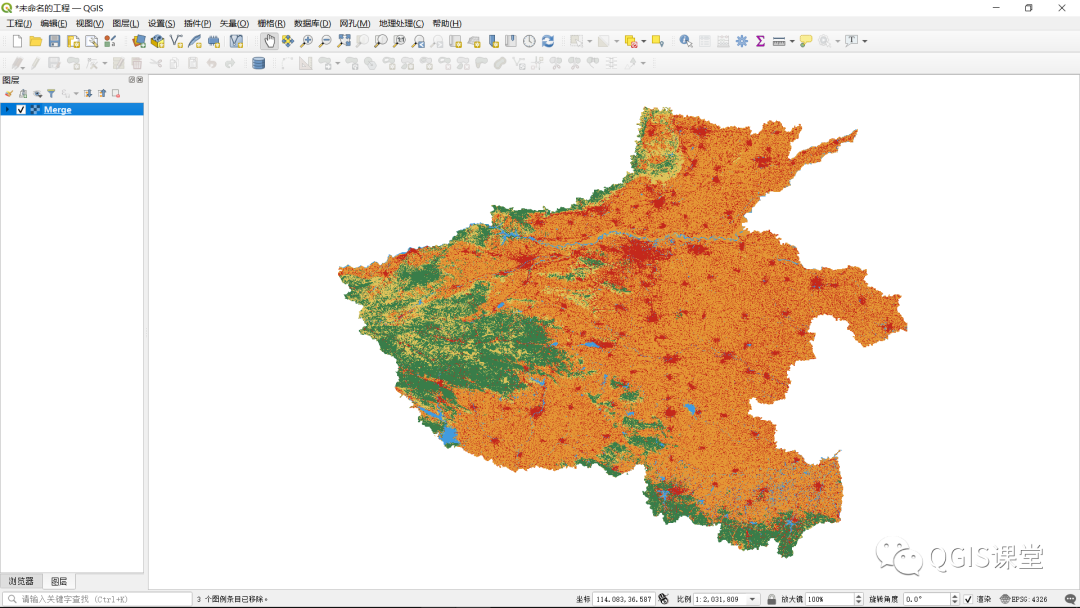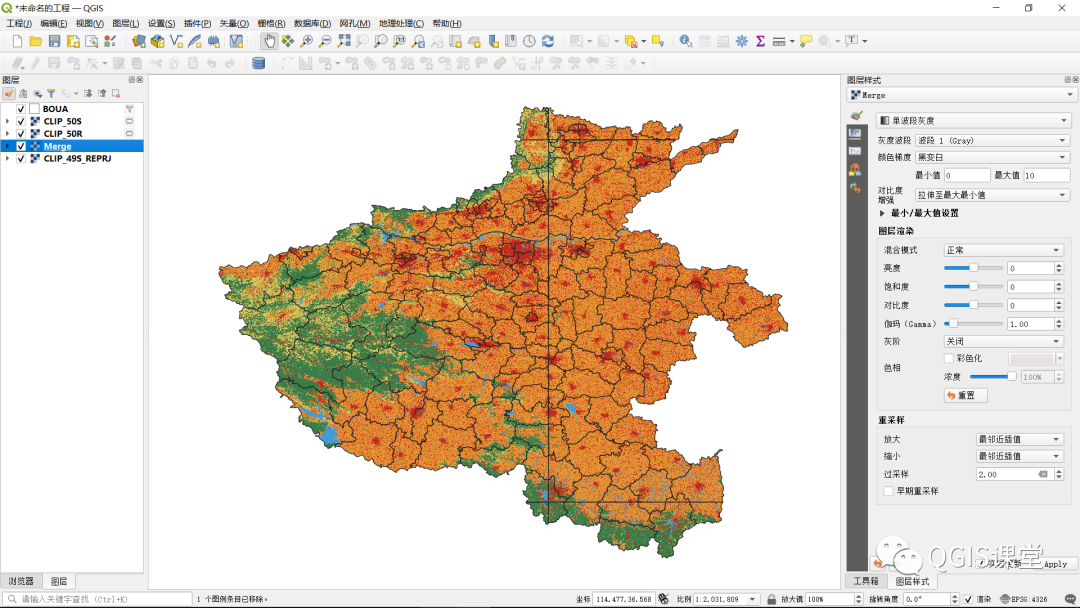 14.由于数据量巨大,合并操作一般需要几十分钟时间,合并生成的栅格文件默认也显示为灰色,参考前述9-10步骤,将其修改为彩色显示。