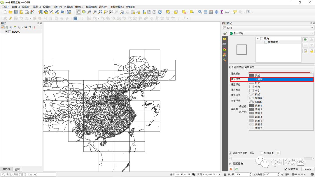1.启动QGIS,加载BOUA.shp图层,将图层“填充样式”设为“无填充”,便于与栅格图层叠加显示。