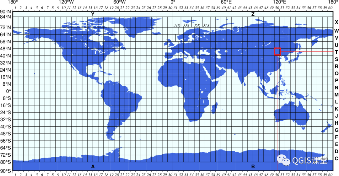 UTM投影包含的纬度范围从南纬80度到北纬84度,采用8度分带,编号从C到X。通过经度分带带号与纬度分带带号的组合(如50T)即可确定一块地理区域范围。如下图所示: