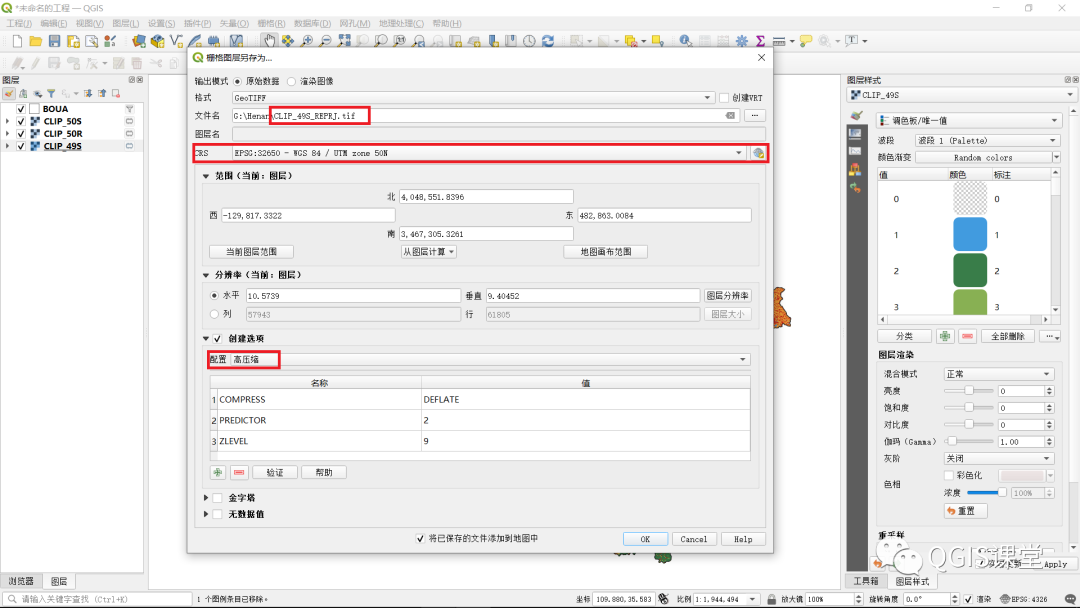 8.下面需要将新生成的三个栅格图层合并为一个栅格图层,以便于进行后续的数据统计。QGIS的栅格合并操作要求输入的栅格图层必须具有相同的CRS,CLIP_50R和CLIP_50S图层的CRS都是EPSG:32650 - WGS 84 / UTM zone 50N,而CLIP_49S图层的CRS则是EPSG:32649 - WGS 84 / UTM zone 49N,需要先进行统一处理。在CLIP_49S图层名上点击右键菜单“导出-->另存为”,在弹出的“栅格地图另存为”对话框中,将输出的栅格文件命名为“CLIP_49S_REPRJ”,将输出图层的CRS设为EPSG:32650 - WGS 84 / UTM zone 50N(通过点击CRS下拉列表右侧的“选择CRS”按钮),在“创建选项”面板的“配置”下拉列表中选择“高压缩”,点击“OK”按钮。