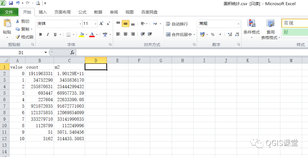 18.打开生成的CSV文件,value、count、m2字段分别代表像元取值、像元数量(个)、面积统计(平方米)。
