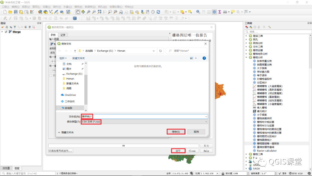 17.在弹出的“保存文件”对话框中,保存类型选择CSV文件,文件名设为“面积统计”,点击“保存”按钮,返回“栅格图层唯一值报告”对话框后,点击“运行”按钮。