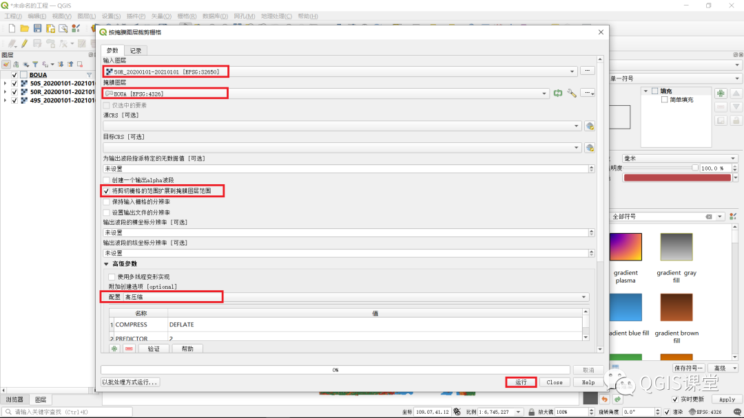 5.弹出“按掩膜图层裁剪栅格”对话框,在“输入图层”下拉列表中选择50R_20200101-20210101,在“掩膜图层”下拉列表中选择BOUA,确保勾选“将剪切栅格的范围扩展到掩膜图层范围”,在“高级参数”面板的“配置”下拉列表中选择“高压缩”,该选项有助于显著压缩裁剪生成的栅格文件大小。设置完毕后,点击“运行”按钮。