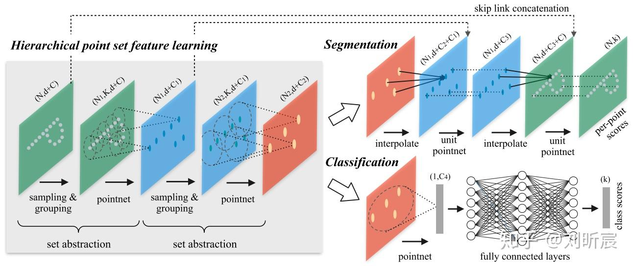 在每一个层次的set abstraction,点集都会被处理和抽象,而产生一个规模更小的点集,可以理解成是一个降采样表征过程,可参考上图左半部分。