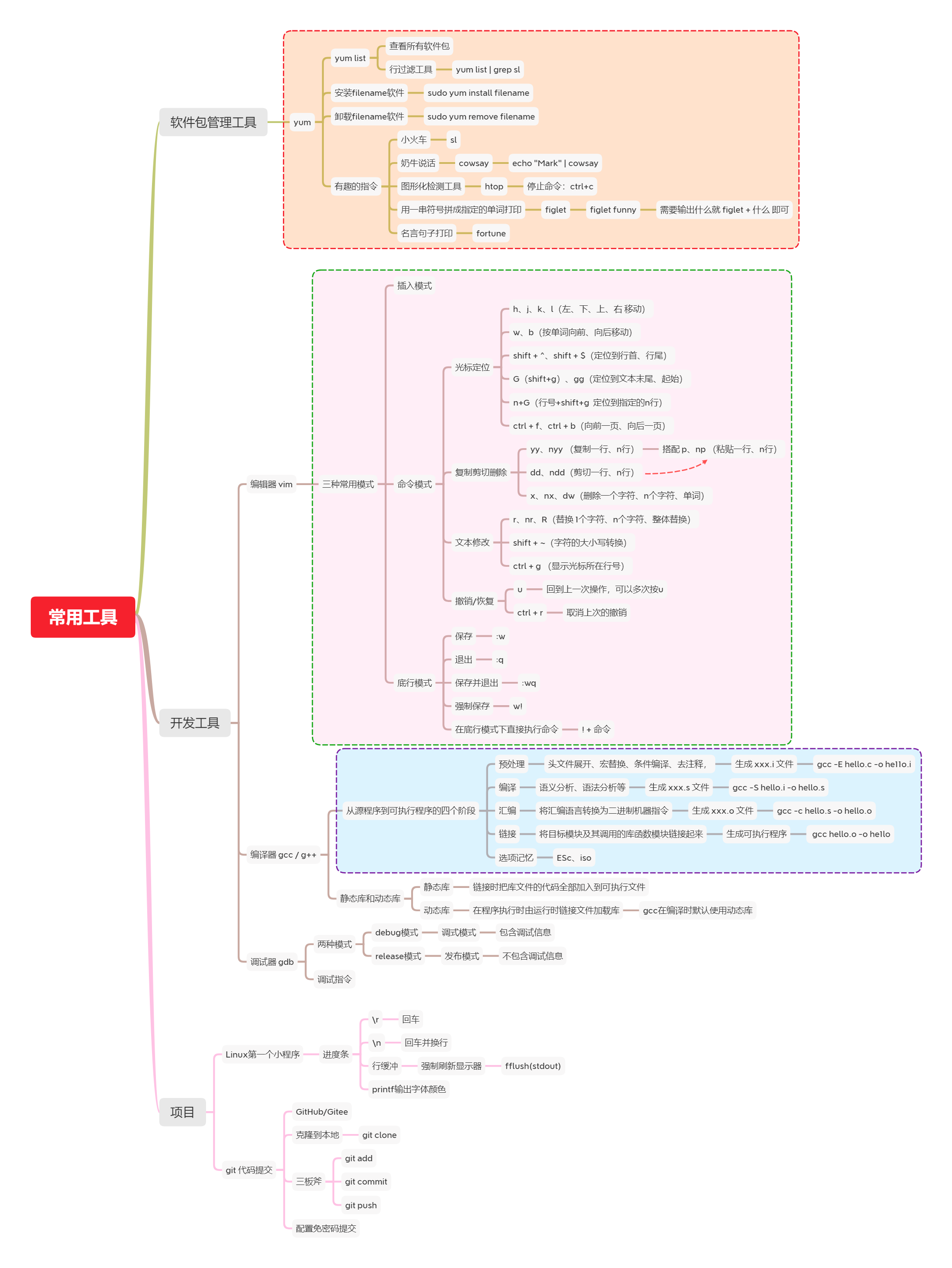 【Linux编程】二、Linux常见工具和项目开发(思维导图总结) 什么是软件包?1)在Linux下安装软件,一个通常的办法是下载程序的源代码,并进行编译,得到可执行程序。2)但是这样太麻烦了,于是有些人就把一些常用的软件提前编译好做成软件包(可以理解成Windows上的`.exe`安装程序)放在一个服务器上,通过包管理器我们就可以很方便的获取到这个编译好的软件包,从而直接进行软件的安装。3)软件包和软件包管理器之间的关系,就好比"App"和"应用商店"这样的关系。