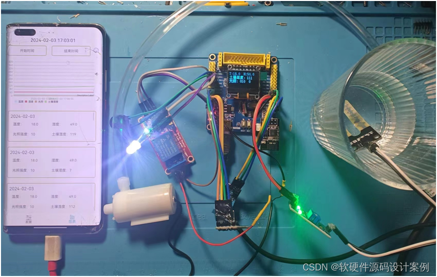 - 按键:可以手动切换模式,实现手动和自动模式的切换,手动模式下可以控制水泵开关,自动模式下可以通过土壤湿度阈值控制;