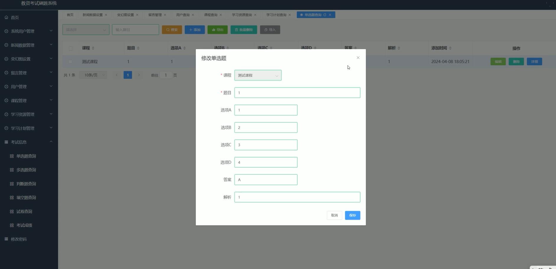 题目CRUD:教师通过表单组件(Element Form)新增/修改题目。