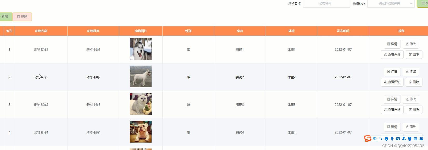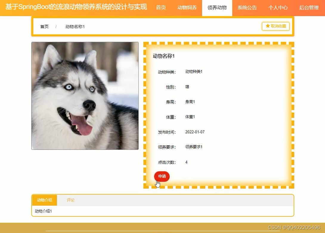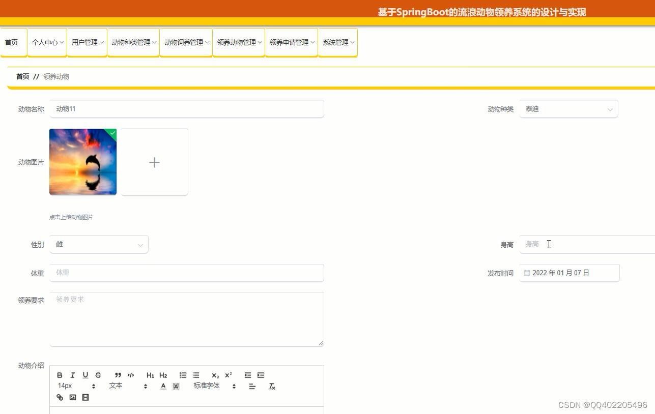 领养申请 (自动编号、动物名称、身高、动物种类、用户姓名、领养原因、审核回复、创建时间、性别、申请时间、用户账号、是否审核、体重、收养地址、联系电话);