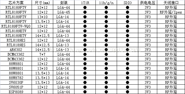 选择的芯片主要是RTL8189系列、AR6302、88W8801、88W8782、BCM43362,还有国内品牌的SV6030P、SV6051P、ESP8089;供电电压有3V3;天线处理方式是通过模块上RF脚外延;以经典型的封装LGA-44、尺寸12*12mm/LGA-13、尺寸14*12.5mm为主,这种封装下不同品牌方案硬件安全兼容;对于一些尺寸完全一样或者接近的模块,硬件上都存在兼容性,跟主板连接的方式SMD贴片方式;