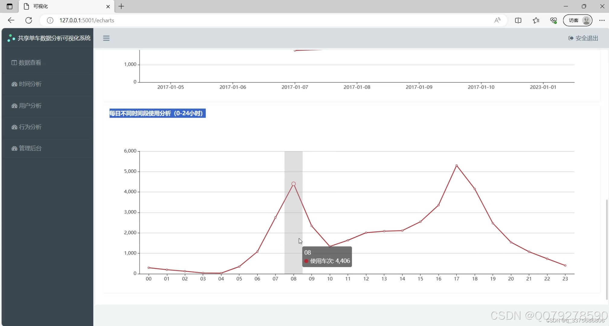 基于大数据的共享单车数据分析系统 Python 可视化 Flask框架 骑行数据分析 计算机毕业设计(源码) 项目技术栈: Python语言、Flask框架、sqlite数据库、Echarts可视化、HTML随着共享经济的飞速发展,共享单车已成为人们日常生活中不可或缺的一部分。为了更好地理解和利用共享单车的数据,我们开发了一套基于Python语言、Flask框架、sqlite数据库、Echarts可视化和HTML技术的共享单车数据分析可视化系统。该系统旨在通过直观、易懂的图表,为用户提供丰富的数据分析功能,帮助决策者更好地把握市场动态,优化运营策略。