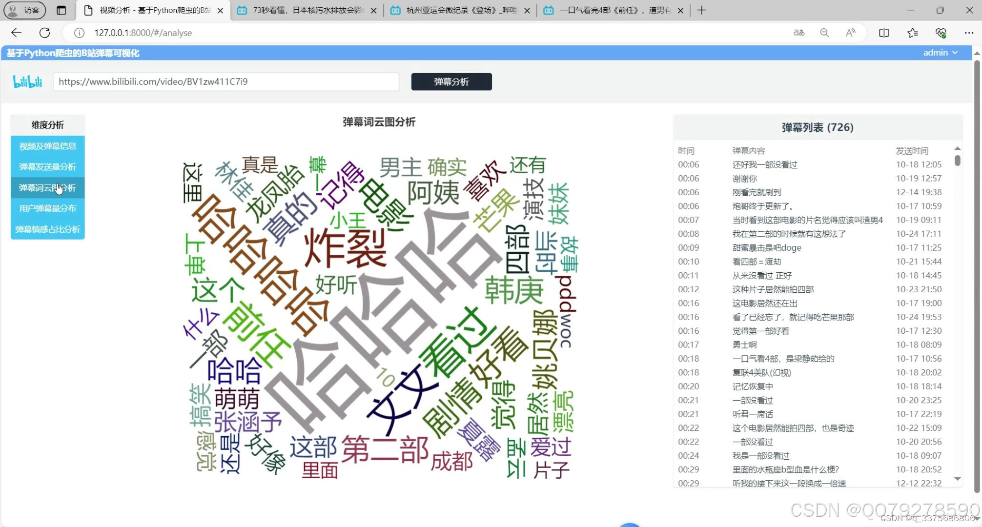 基于python哔哩哔哩弹幕数据分析可视化系统 B站 bilibili 弹幕 Django框架 大数据毕业设计(源码) 技术栈:Python语言、Django框架、Echarts可视化、requests爬虫、HTML(1)B站弹幕词云图分析(2)B站弹幕情感占比分析(3)用户弹幕数量分布(4)弹幕不同时间发送量分析(5)B站弹幕列表(6)输入需要分析弹幕的B站视频链接(7)后台管理随着互联网技术的快速发展,弹幕文化在视频分享平台如Bilibili(简称B站)上得到了广泛的应用。为了深入了解B站用户的弹幕行为,我们设计并开发了一款基于Python的B站弹幕分析可视化系统。该系统利用。