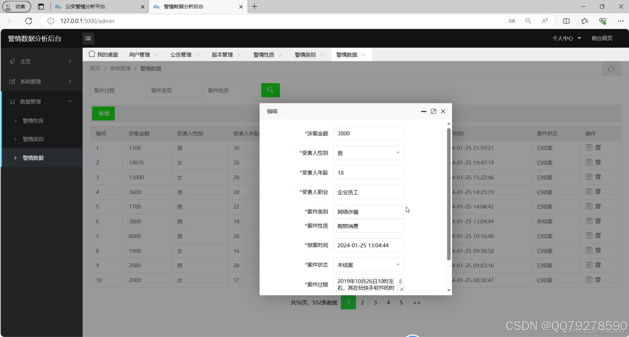 公安大数据 python公安警情数据可视化分析大屏 公安分析系统 公安数据 可视化 Flask框架 计算机毕业设计(源码) 技术栈:Python语言、Flask框架、MySQL数据库、Echarts可视化、HTML公安警情可视化分析大屏案件类型统计:网络诈骗、电信诈骗、网络盗窃、特殊涉案范围排名:购物消费、冒充类、信贷理财、招聘兼职、婚恋交友、网络盗窃不同时间段报案分析、年月日案件数统计、警情实时数据展示、近30日报案量分析、案件处理率、受害人性别占比关键词:公安系统;警情可视化;Python;MySQL。