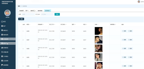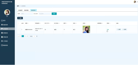 在线咨询在视图层(view层)进行交互,比如点击“修改 ”按钮或填写在线咨询需求信息表单。这些在线咨询动作被视图层捕获并作为请求发送给相应的控制器层(control1er层)。控制器接收到这些请求后,调用服务层(service层)以执行相关的业务逻辑,例如验证输入数据的有效性和与数据库的交互。服务层处理完这些逻辑后,进一步与数据访问对象层(DAO层)交互,后者负责具体的数据操作如查询、修改、更新或删除在线咨询,并将操作结果返回给控制器。最终,控制器根据这些结果更新视图层,以便在线咨询可以看到最新的信息或相应的操作反馈。在在线咨询页面的输入栏中输入标题、员工工号进行查询,可以查看到在线咨询详细信息,并根据需要进行修改或者删除等操作,如图5-11所示。