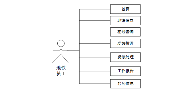 地铁员工的功能主要是对个人账号和密码进行更新管理,对首页、地铁信息、在线咨询、反馈投诉、反馈处理、工作报告、我的信息进行查询详情操作。