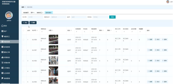 地铁信息在视图层(view层)进行交互,比如点击“添加”按钮或填写地铁信息需求信息表单。这些地铁信息动作被视图层捕获并作为请求发送给相应的控制器层(control1er层)。控制器接收到这些请求后,调用服务层(service层)以执行相关的业务逻辑,例如验证输入数据的有效性和与数据库的交互。服务层处理完这些逻辑后,进一步与数据访问对象层(DAO层)交互,后者负责具体的数据操作如查询、添加、更新或删除地铁信息,并将操作结果返回给控制器。最终,控制器根据这些结果更新视图层,以便地铁信息可以看到最新的信息或相应的操作反馈。在地铁信息页面的输入栏中输入车次号、地铁站点、起点、终点进行查询,可以查看到地铁信息详细信息,并根据需要进行添加或者删除等操作,如图5-10所示。