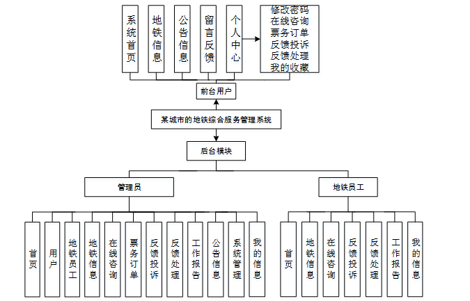 对本系统进行全面的系统功能的分析,可以得出基于Spring boot的某城市的地铁综合服务管理系统的功能模块图,如图4-1所示。