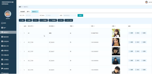 地铁员工在视图层(view层)进行交互,比如点击“添加”按钮或填写地铁员工需求信息表单。这些地铁员工动作被视图层捕获并作为请求发送给相应的控制器层(control1er层)。控制器接收到这些请求后,调用服务层(service层)以执行相关的业务逻辑,例如验证输入数据的有效性和与数据库的交互。服务层处理完这些逻辑后,进一步与数据访问对象层(DAO层)交互,后者负责具体的数据操作如查询、新增、更新或删除地铁员工,并将操作结果返回给控制器。最终,控制器根据这些结果更新视图层,以便地铁员工可以看到最新的信息或相应的操作反馈。在地铁员工页面的输入栏中输入员工工号、员工姓名、性别进行索搜,可以查看到地铁员工详细信息,并根据需要进行添加或者删除等操作,如图5-9所示。