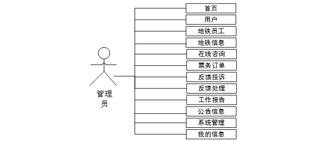 用户的功能主要是对个人账号和密码进行更新管理,对系统首页、地铁信息、公告信息、留言反馈、个人中心进行查询详情操作。