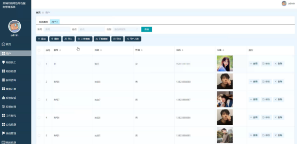 用户在视图层(view层)进行交互,比如点击“添加”按钮或填写用户需求信息表单。这些用户信息动作被视图层捕获并作为请求发送给相应的控制器层(control1er层)。控制器接收到这些请求后,调用服务层(service层)以执行相关的业务逻辑,例如验证输入数据的有效性和与数据库的交互。服务层处理完这些逻辑后,进一步与数据访问对象层(DAO层)交互,后者负责具体的数据操作如查询、添加、更新或删除用户信息,并将操作结果返回给控制器。最终,控制器根据这些结果更新视图层,以便用户信息可以看到最新的信息或相应的操作反馈。在用户信息页面的输入栏中输入账号、姓名、性别进行查询,可以查看到用户详细信息,并根据需要进行添加或者删除等操作,如图5-8所示。