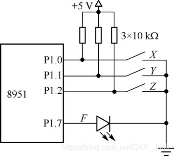 15.某系统具有三人表决器的功能,如图所示。当某人同意时,将开关闭合。当两人及三人同意时表示通过,此时与P1.7相连的LED被点亮。编程实现此功能。