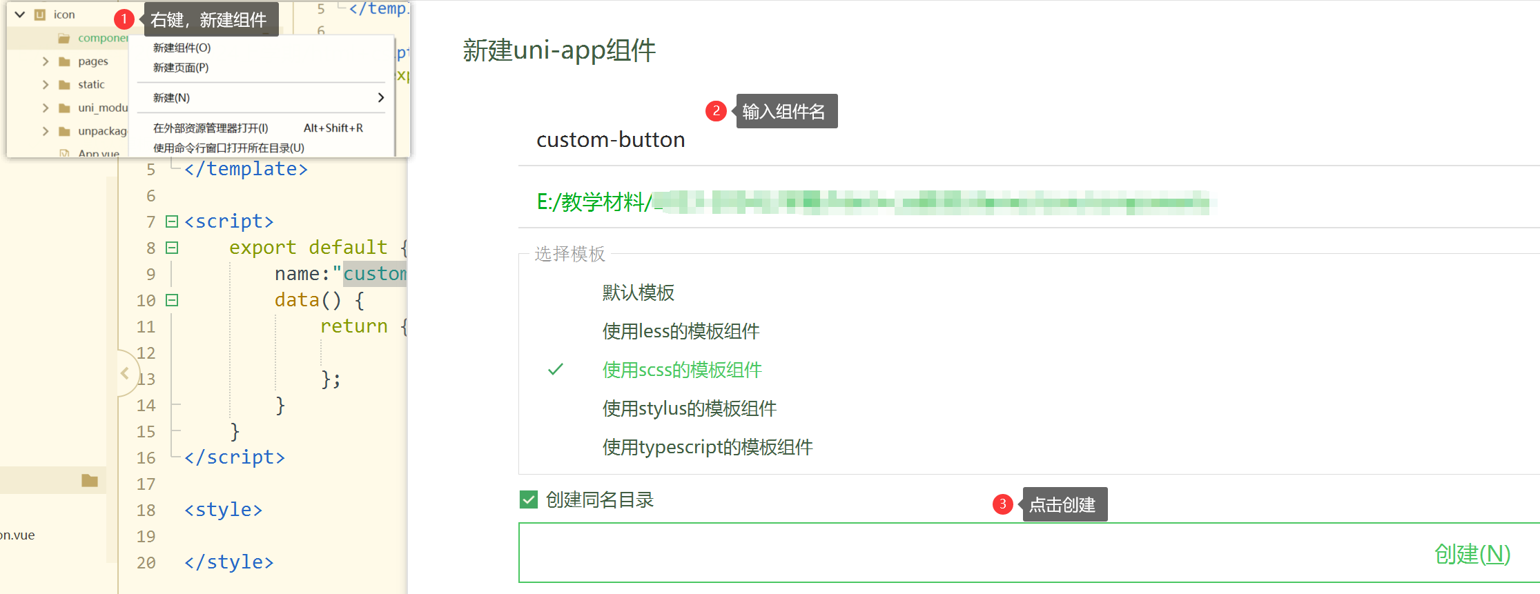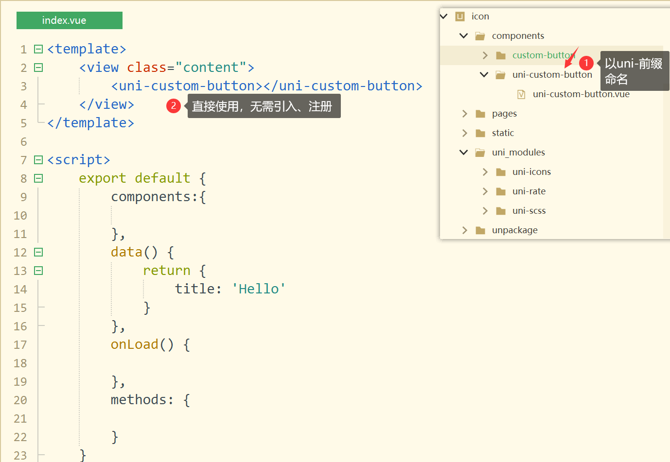 如果在新建自定义组件的时候,起名字的时候以uni-开头,即可直接在页面使用,不需要引入和注册,例如: