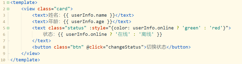2. 创建子组件UserCard,通过props接收user对象,显示用户信息,并有一个按钮,点击时切换在线状态。