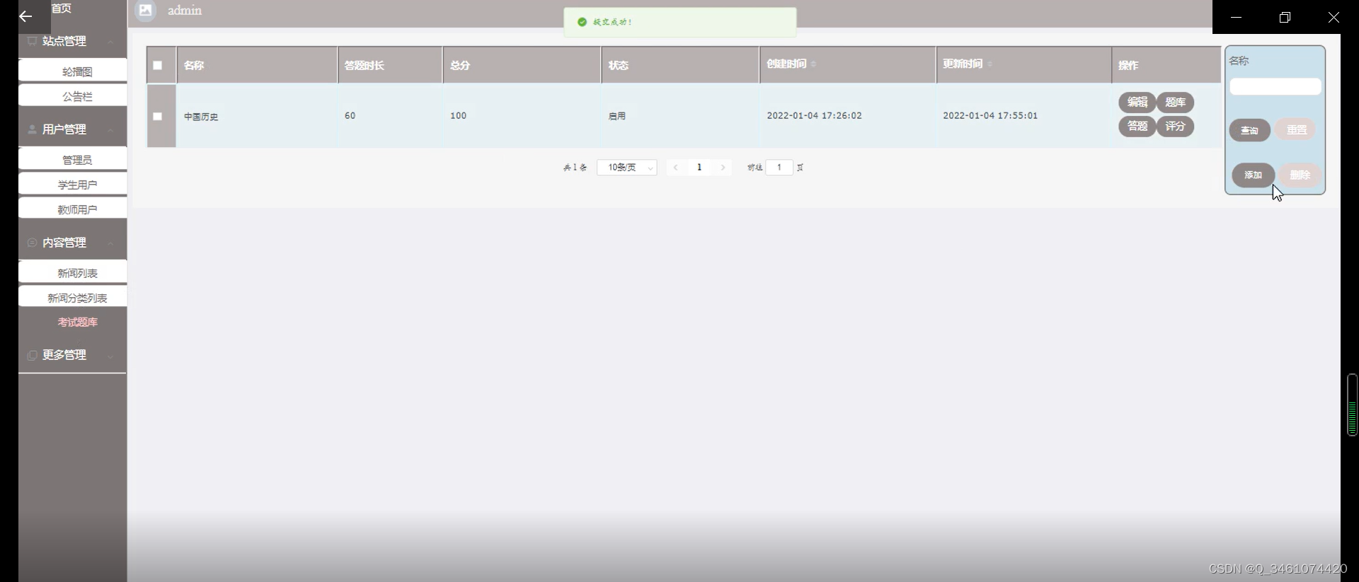 | 点击添加试题,必填项合法输入,点击保存 | 提示添加成功 | 与预期结果一致 |