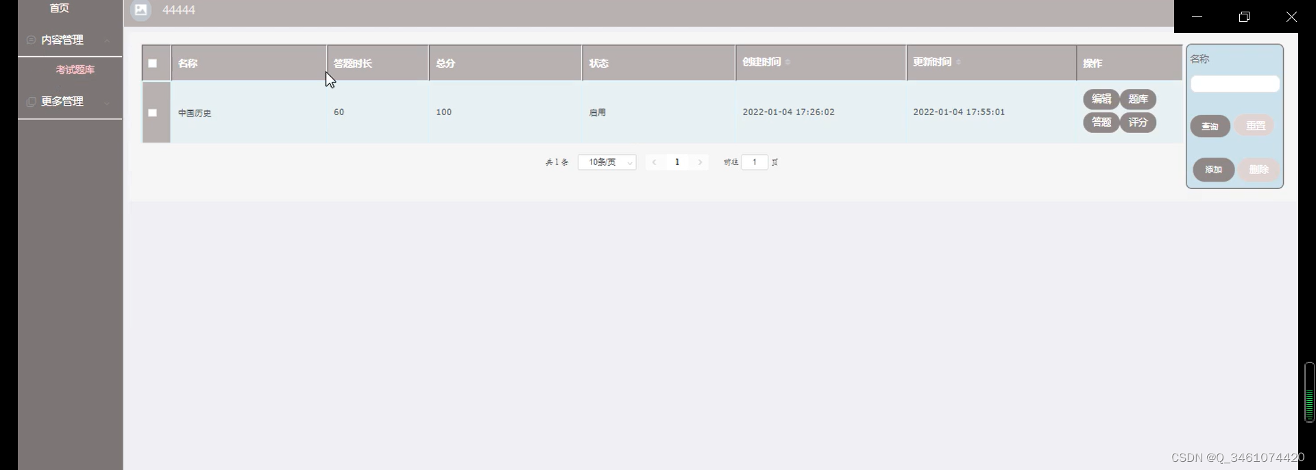 | 测试目的 | 检测考试题库时的各种操作的运行情况 | |