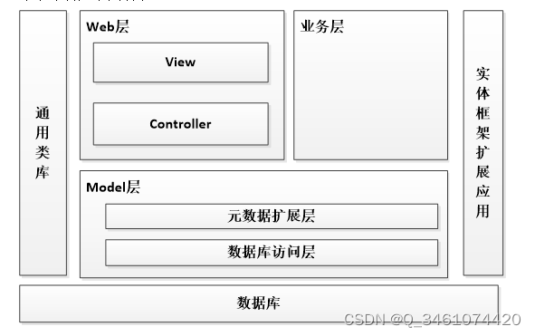 本在线考试系统的架构设计主要分为可以3层,主要有Web层,业务层,Model层。其中web层还包括View层和Controller层,Model层包括元数据扩展层和数据访问层。