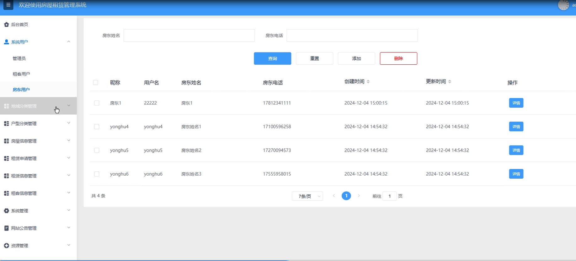 - 租客信息管理:管理员可以查看租客信息列表所有详情,可以进行增删改查操作。