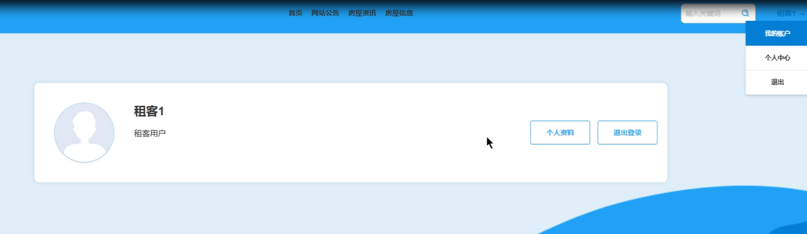 当用户点击右上角“我的”这个按钮,会出现子菜单,点击“个人中心”可以对首页、房屋申请、租赁信息、租客信息、收藏管理,个人中心界面如下图4-7所示。