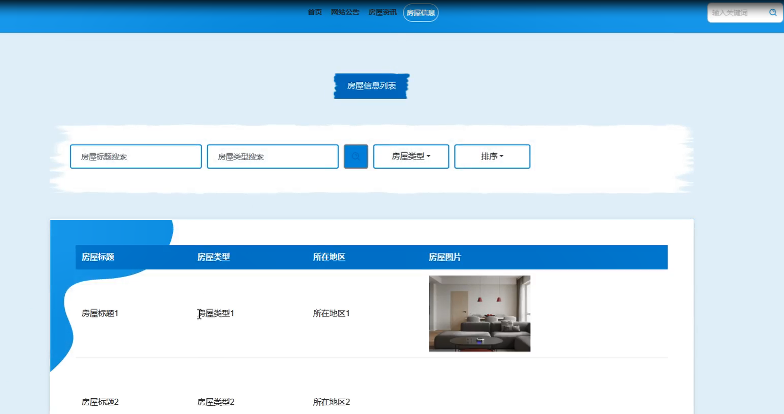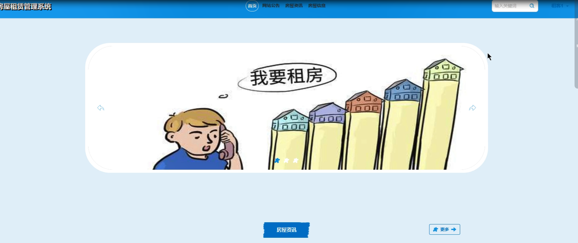 (2)首页:房屋租赁管理系统的首页信息包含了首页、网站公告、房屋资讯、房屋信息等。