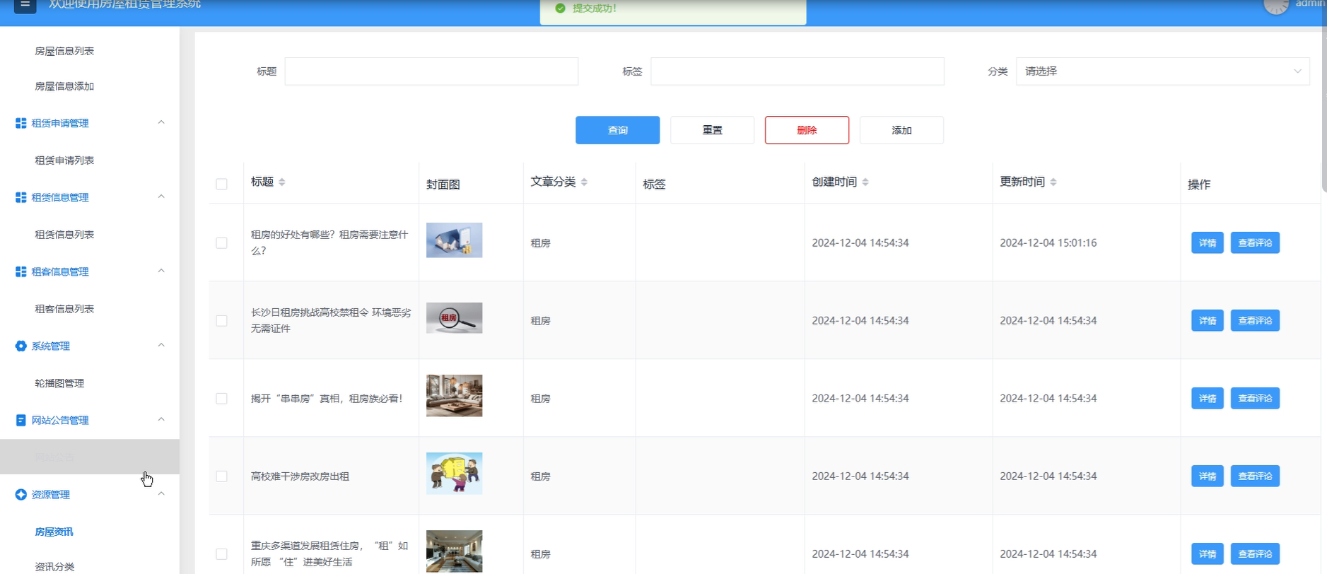 - 资源管理:管理员点击“资源管理”菜单能够对其下子菜单房屋资讯和房屋资讯的分类进行增删改查。