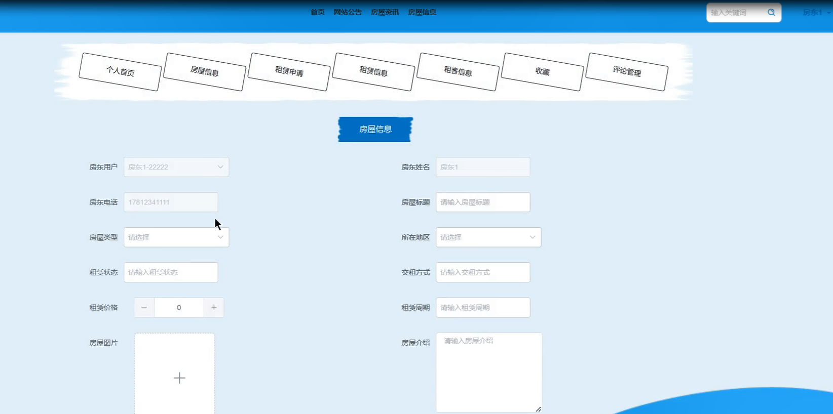 房东点击个人中心下的“房屋信息”这一菜单按钮,可以进行添加房屋信息,界面如下图4-13所示。
