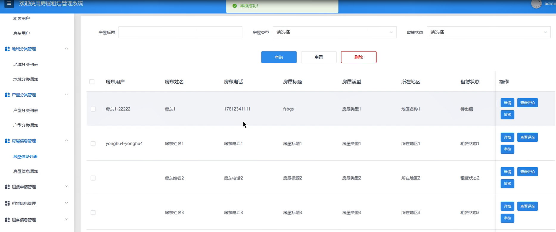 - 房屋信息管理:管理员可以对房屋信息列表和房屋信息添加,管理审核房东提交的房屋信息。