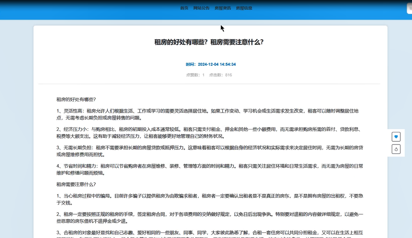 (4)房屋资讯:当用户点击“房屋资讯”这一菜单按钮,会显示管理员在后台发布的所有的房屋资讯,可以查看详情,进行收藏、点赞、评论等;