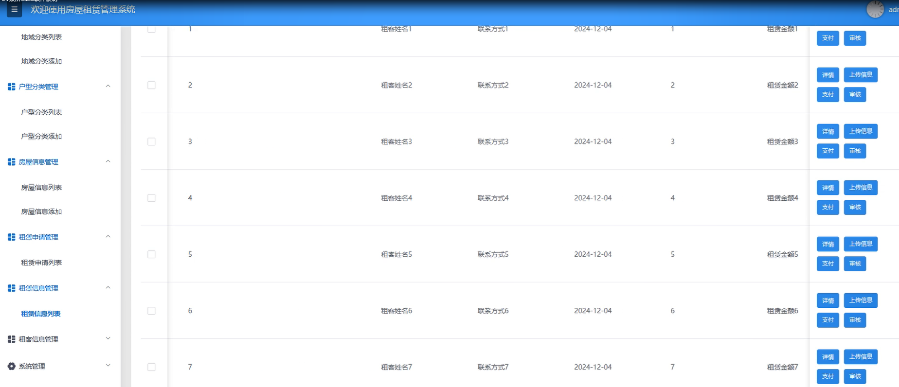 - 租赁信息管理:管理员可以查看租赁信息列表所有详情,可以进行增删改查操作。
