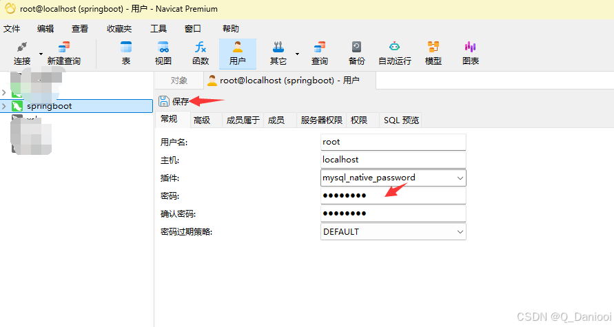 连接上数据库后点击用户,然后选择你自己的用户(一般只有一个root@localhost),双击打开它,然后改成我们自己的密码,最后保存就OK啦。